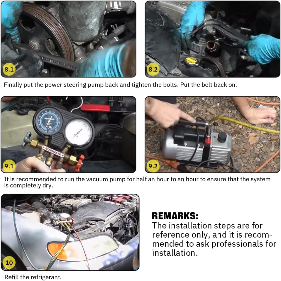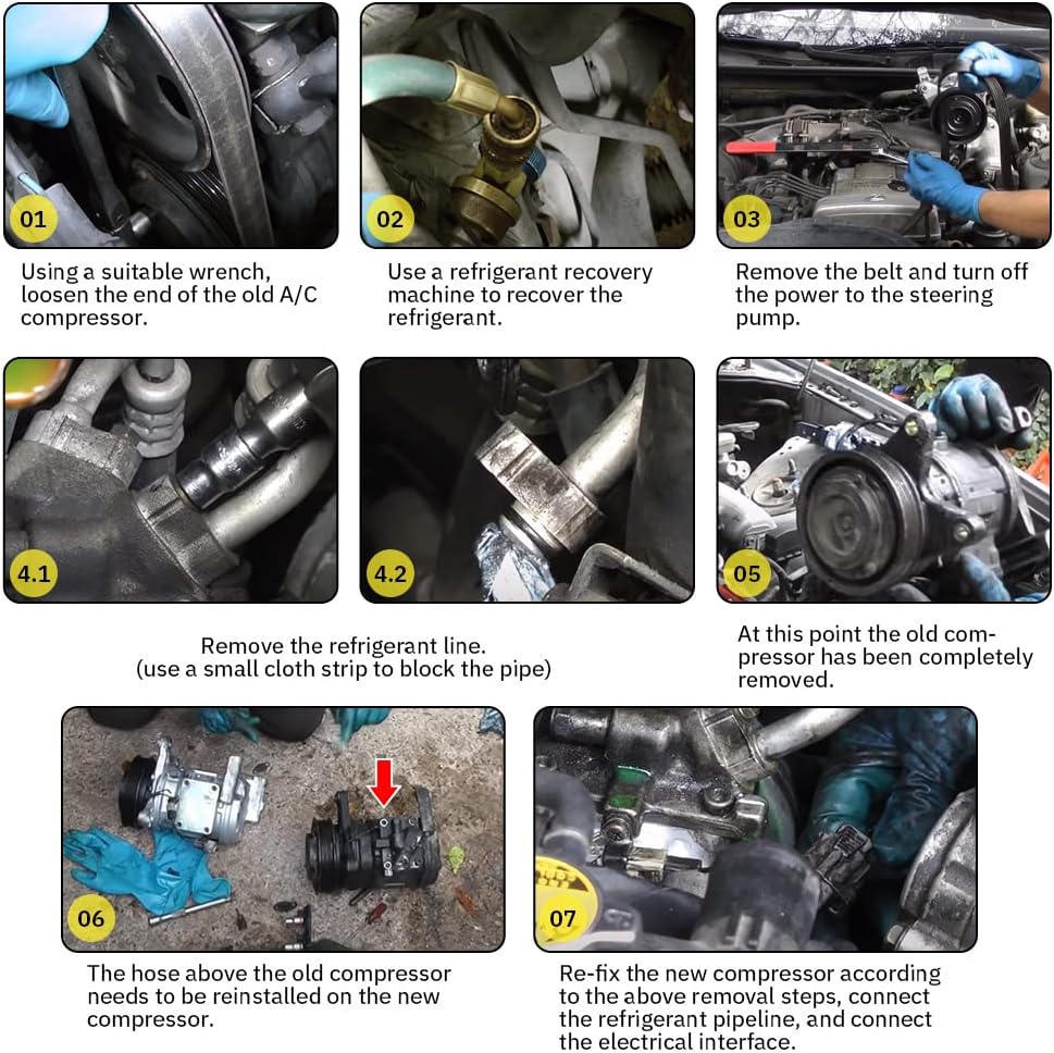 Common Fault Analysis:Aging: Compressor gets aging and produces impurities, which block the pipes, or dry bottles become invalid, the ice causes the blockage.Pressure: Poor heat dissipation or excessive refrigerant results in high pressure, which may cause pressure valve breakage or deformation.Leakage: The pipe assembly is installed loosely or the rubber is aging, which may cause leakage.Oil Starvation: When the system is not properly lubricated, the compressor part burns out.Application: For 06-11 Honda Civic DX L4 1.8L SOHC MFI GAS.For 08-11 Honda Civic DX-G L4 1.8L SOHC MFI GAS.For 06-11 Honda Civic EX L4 1.8L SOHC MFI GAS.For 08-11 Honda Civic EX-L L4 1.8L SOHC MFI GAS.For 09-10 Honda Civic EX-L L4 1.8L SOHC MPI GAS.For 06-07 Honda Civic EXS L4 1.8L SOHC MFI GAS.For 06-11 Honda Civic GX L4 1.8L SOHC MFI CNG.For 06-11 Honda Civic LX L4 1.8L SOHC MFI GAS.For 06-07 Honda Civic LXS L4 1.8L SOHC MFI GAS.For 09-11 Honda Civic LX-S L4 1.8L SOHC MFI GAS.For 09-10 Honda Civic Sport L4 1.8L SOHC MFI GAS.Caution: Vehicle compatibility charts are for REFERENCE ONLY. Check your vehicle with OEM below to match your needs.OE Number:38810RNAA01/ 38810RNAA02/ 38810RRBA02/ 38810RRBA01/ 38800-RNA-A010-M/ 38800-RNB-A02/ 38800RNAA010M2/ 38800R62H01/ 38800RZVG020M2/ 38800RZVG022M2.References Number:CO4918AC.5512349/ 6512349/ 7512349.255528/ 275739/ TEM255528/ TEM275739.2004918/ 2004918AM/ 2004918R/ 2021929/ 2021929R.C1804/ C1804R/ C2468/ C2468R.3410/ 3428/ 3766/ 4901/ 4918/ 4918U1.140250/ 140250C/ 140250NC/ 140250NEW.10361921/ 638880/ 97555/ 98555/ 0610225/ 0174.Package Included: 1x A/C Compressor w/ Clutch. (100% Brand New Never Used Or Installed)Installation Steps:Using a suitable wrench, loosen the end of the old A/C compressor.Use a refrigerant recovery machine to recover the refrigerant.Remove the belt and turn off the power to the steering pump, and disconnect the electrical connections.Remove the refrigerant line. (use a small cloth strip to block the pipe)At this point, the old compressor has been completely removed.Pour four ounces of oil into the new compressor.The hose above the old compressor needs to be reinstalled on the new compressor.Re-fix the new compressor according to the above removal steps, connect the refrigerant pipeline and connect the electrical interface.Finally, put the power steering pump back and tighten the bolts. Put the belt back on.It is recommended to run the vacuum pump for half an hour to an hour to ensure that the system is completely dry.Refill the refrigerant.Remarks: The installation steps are for reference only, and it is recommended to ask professionals for installation.