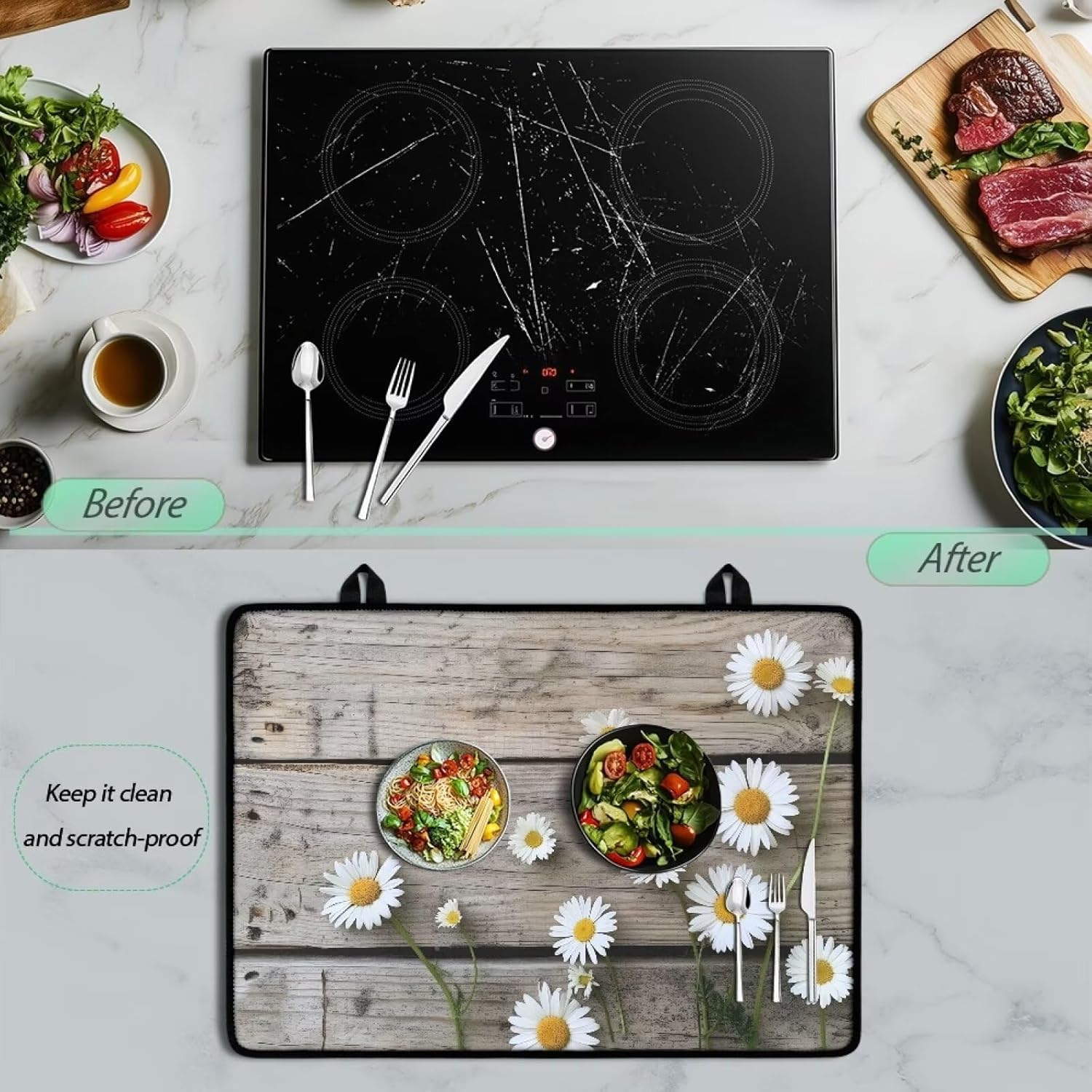 Sellikakes Stove Top Covers Features Our stove top cover for electric stove is made of premium polyester and rubber, waterproof and wear resistant, dustproof and anti greasy, lightweight and foldable, anti scalding and heat resistant, easy to clean and storage while you not in use, not take up much space. Dimensions: 29.18’’ L x 0.16’’ W x 20.96’’ H inch, suitable for most standard stove top, can be use as a food prep table, kitchen drying mat. Easy to Use and Clean: After using, simply hand wash or pop your stovetop cover in the dishwasher, then fold, roll or hang with included hooks for easy storage. Expand your Workspace Not just a cooktop mat, it doubles your work space in the kitchen, ensuring your electric cooktop remains pristine. Note: Please make sure your stove top cools down before you put the stove cover on and ensure that it is not used while cooking!!!