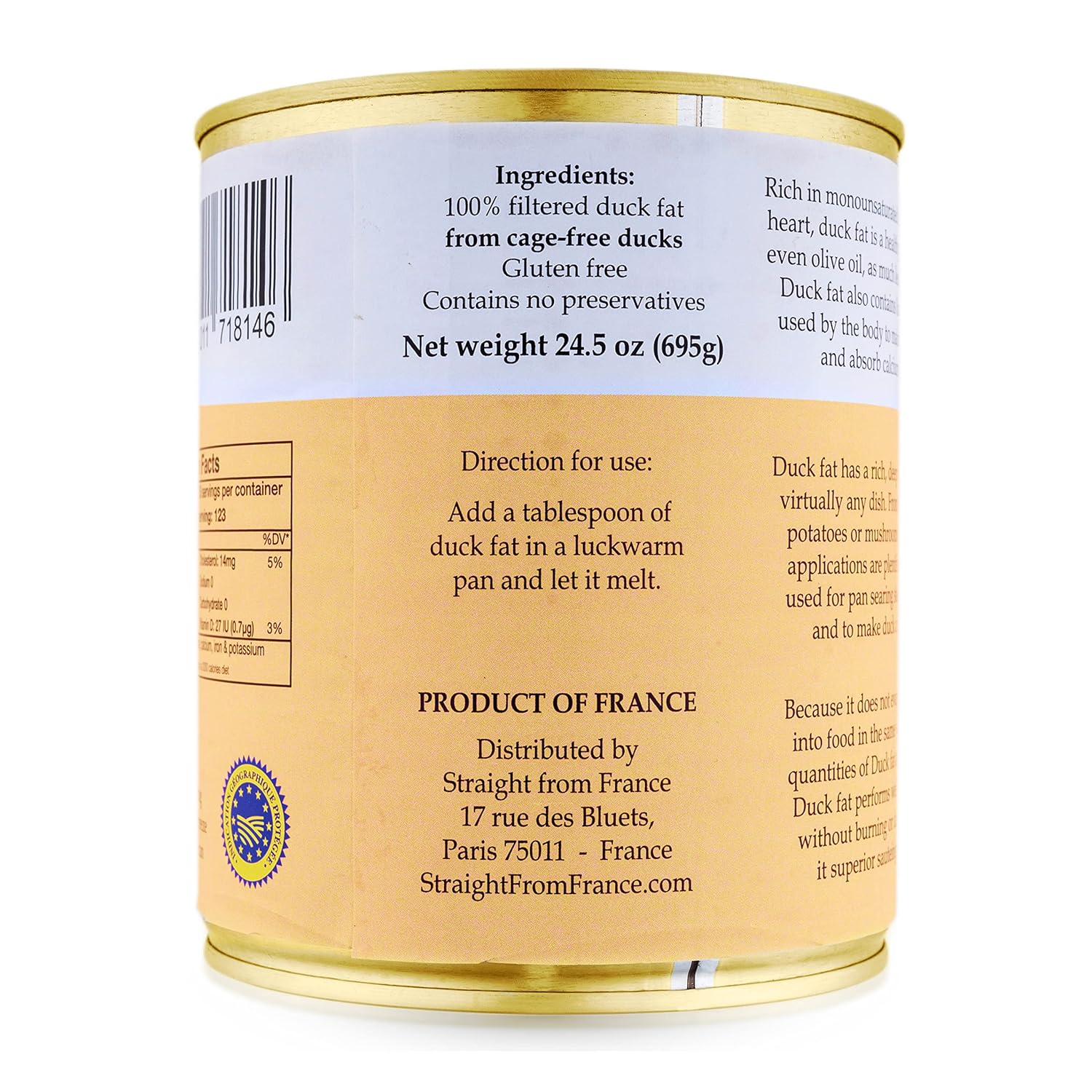 | Flavor | Pure non flavored duck fat. |