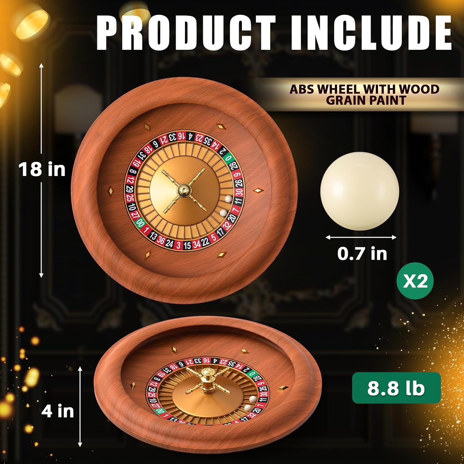 Feature: Crafted from a quality ABS material, the roulette wheel perfectly mirrors the durability, longevity, and resilience of the ones found in professional casinos. Its delicate construction ensures smooth and uninterrupted spins, letting you enjoy a seamless gaming experience. The package includes an 18 inches roulette wheel with a perfectly balanced zero layout and 2 casino grade roulette balls, not only visually appealing but also enhances the authenticity of your gaming experience, giving you the true feel of a professional roulette game. This roulette set is proper for both home game nights and professional use. Not only does it serve as an entertaining addition to your gatherings, but it's also an excellent choice for events, fundraisers, or casino themed parties. Specifications: Quantity: 1 Material: ABS Color: wooden color Size: about 18 inches Package contents: 1 x Professional roulette wheel set 2 x Roulette balls Warm notes: Please allow differences due to manual measurement Due to the difference of light and monitor, the color may be slightly different