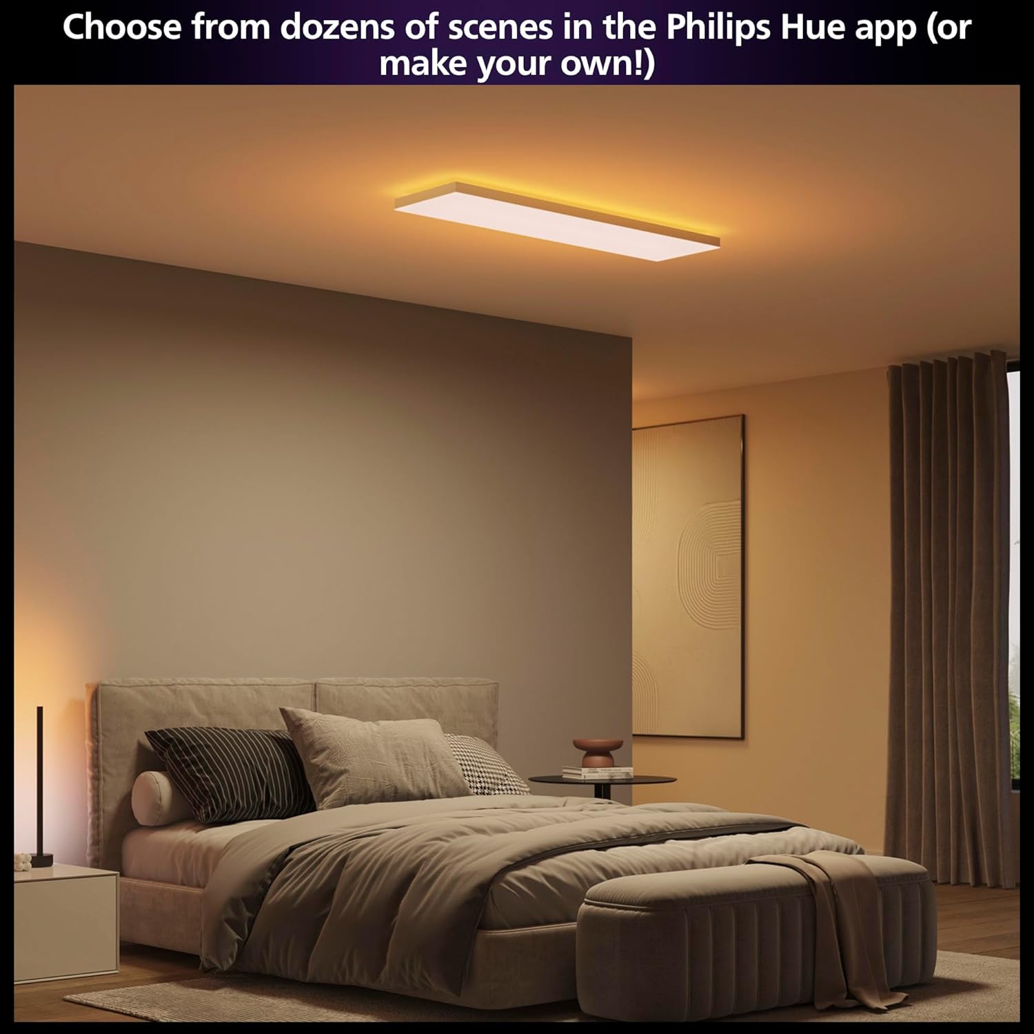 Personalize your home with PHILIPS Hue Datura Smart Ceiling PanelThe Datura ceiling LED panel light is a unique light that features a diffused main light and subtle backlight. With White & Color Ambiance lights, they can shine any color of your choice to create unique combinations of color.Designed to fit seamlessly into your home decorEach light can be controlled individually or grouped into a Zone to control at once. With its frameless design and slim profile, the Datura ceiling panel blends into any living room, bedroom, or kitchen. It is available in three shapes: square, rectangle, and circle, giving you flexibility in choosing a design that fits your space.Easy to set up and useThe smart LED light with a high-quality reflective coating is easy to install. Simply install the light base and hang the ceiling panel by the included hooks to wire it into your home's electricity, then simply click the panel into place. You can control both lights individually in the PHILIPS Hue app and choose from dozens of scenes in the PHILIPS Hue App or make your own!Key Benefits: Smart lightingWhite & Color AmbianceBluetooth compatibleVoice controlFrameless design and slim profile Preset scenes